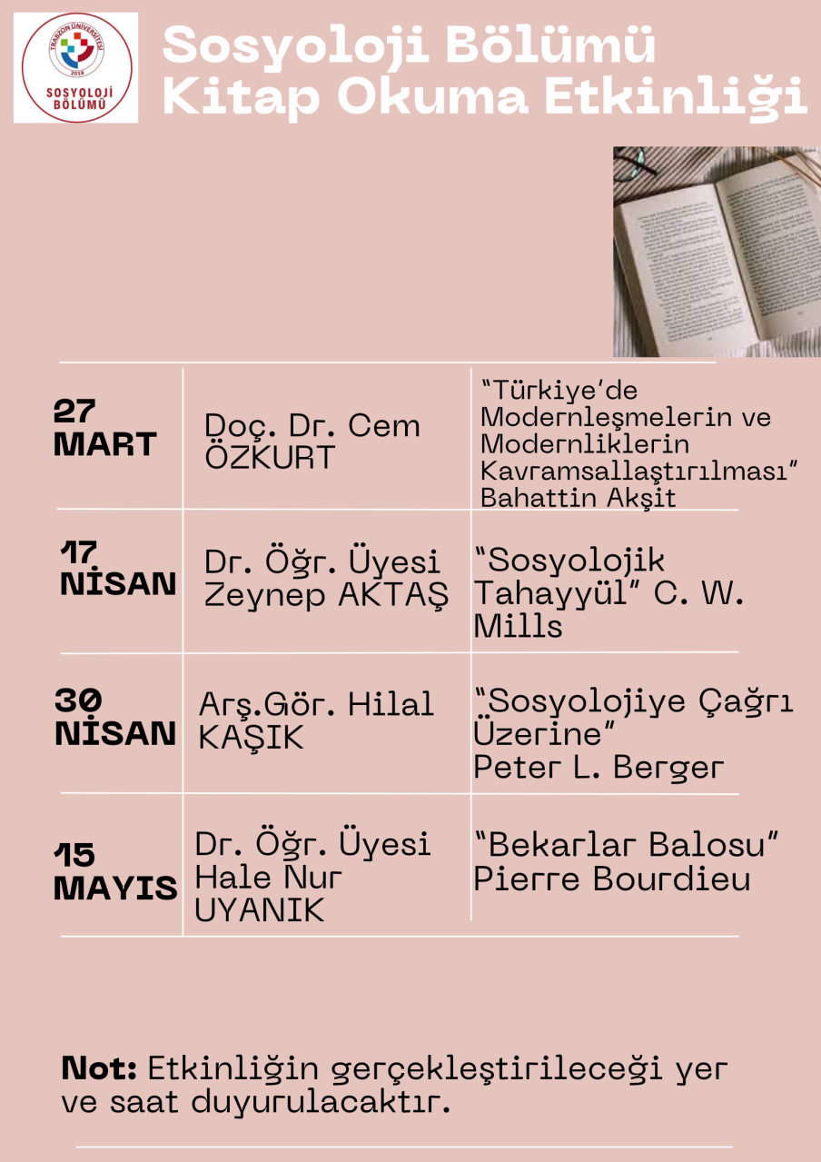 Etkinlik kapsamında sosyoloji literatüründe önemli yere sahip eserler, bölüm öğretim elemanlarının moderatörlüğünde okunacak ve tartışılacaktır. Öğrencilerimizin sosyolojik kavramları daha derinlikli biçimde değerlendirmelerine katkı sağlaması hedeflenen bu etkinlik, aynı zamanda ortak bir akademik tartışma ortamı oluşturmayı amaçlamaktadır.