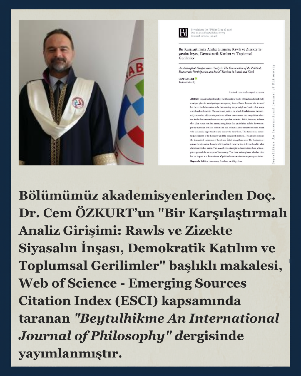 Bölümümüz akademisyenlerinden Doç. Dr. Cem ÖZKURT’un "Bir Karşılaştırmalı Analiz Girişimi: Rawls ve Zizekte Siyasalın İnşası, Demokratik Katılım ve Toplumsal Gerilimler" başlıklı makalesi, Web of Science - Emerging Sources Citation Index (ESCI) kapsamında taranan "Beytulhikme An International Journal of Philosophy" dergisinde yayımlanmıştır.